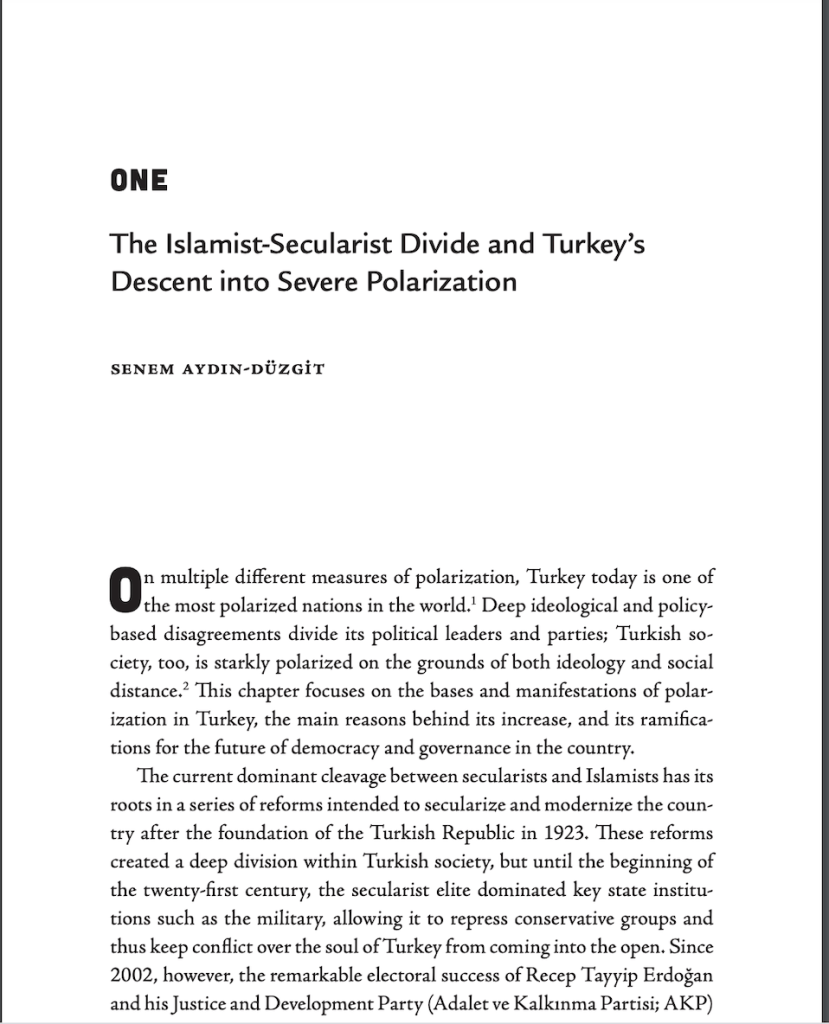 Senem Aydın-Düzgİt (2019) The Islamist-Secularist Divide and Turkey’s Descent into Severe Polarization, (in Democracies Divided: The Global Challenge of Political Polarization, edited by Tom Carothers and Andrew O’Donohue (Washington: Brookings Institution Press).