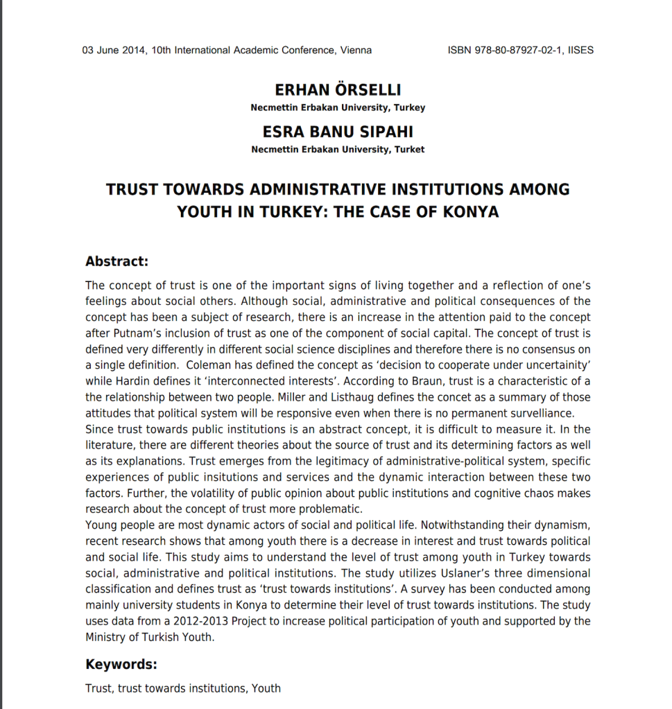 Erhan Örselli & Esra Banu Sipahı (2014). “Trust towards Administrative Institutions among Youth in Turkey: the Case of Konya,” Proceedings of International Academic Conferences 0201765, International Institute of Social and Economic Sciences.